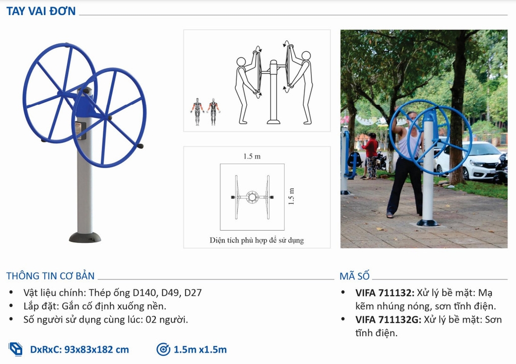 Máy tập tay vai VIFA-711132 (hay còn gọi là thiết bị xoay tay vai) là sản phẩm không thể thiếu trong bất kỳ cụm máy tập công viên nào. Thiết bị được thiết kế với hai bánh lái xoay đối xứng, cho phép người tập thực hiện các động tác xoay tròn cánh tay để bôi trơn các khớp vai và khuỷu tay. Với kết cấu thép đạt chuẩn Thương hiệu Quốc gia, VIFA-711132 không chỉ hỗ trợ rèn luyện thể chất mà còn là điểm nhấn hiện đại cho khuôn viên sân tập.
